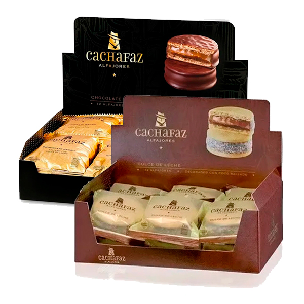 Caja Combinada de 6 Alfajores de Chocolate Rellenos con Dulce de Leche y 6 de Maicena Rellenos con Dulce de Leche «Cachafaz»